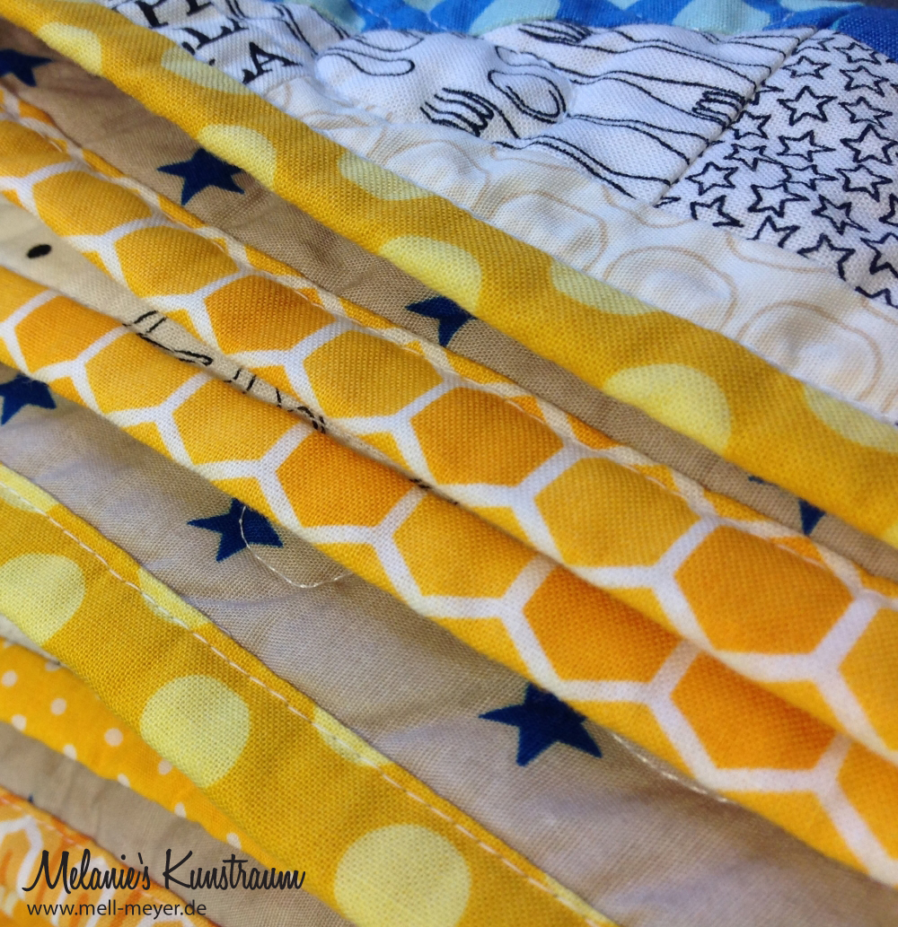 The scrappy yellow binding is of the same fabrics as the stars. And I really like the joyfull, sunny touch it gives the quilt.