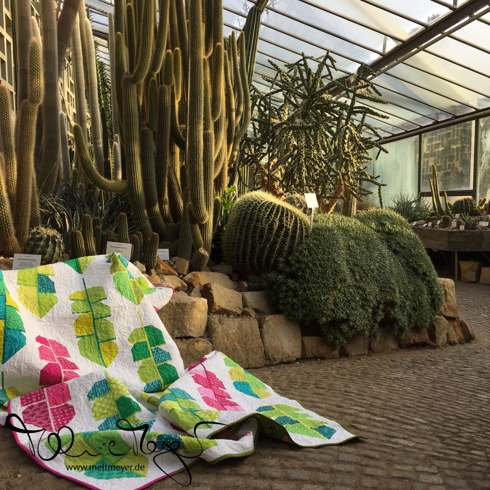 As soon as I saw the picture with the cacti, I was immediately reminded of our time visiting Planten un Blomen and the greenhouse within. It was such a beautiful sunny day. This quilt captures the beauty of the gardens (green for the trees and leaves and pink for the flowers). You chose a perfect setting for the photoshoot.